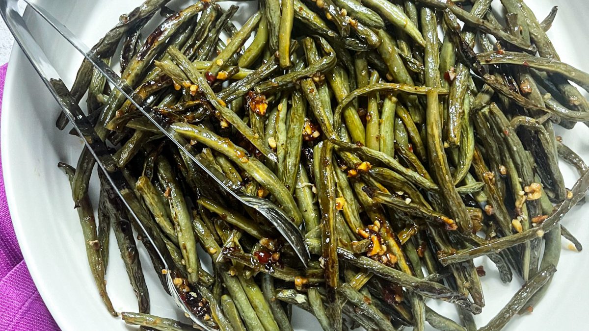 Place the string beans in a jelly roll pan or large roasting pan. Scoop the sauce on top and use your hands (I use gloves) to rub the sauce all over the strings beans well.